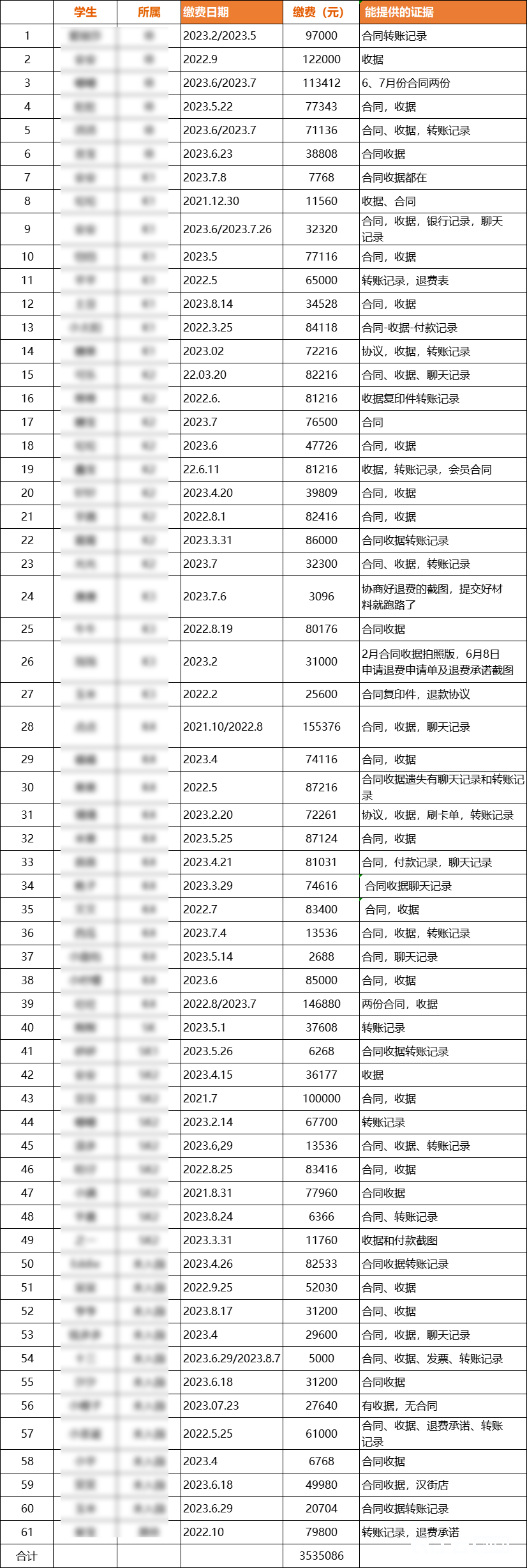 然而,就在机构跑路前的7至8月间,机构销售宋某还在以开学季优惠活动为噱头,诱导大量家长缴纳大额预付款,在徐女士提供的一长串受害家庭缴费清单中可见,超过一半家长今年才第一次报名,甚至有家长在闭园前几天刚签完合同缴纳预付款,孩子还没上学,机构却已经关门了。