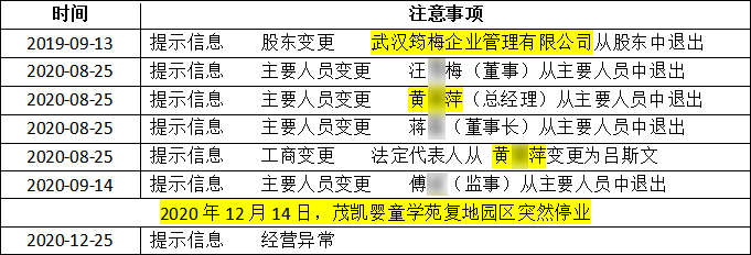 记者调查发现,茂凯的运营主体博思美邦(武汉)科教发展有限公司与童和家的运营主体武汉童和家教育咨询有限公司,历史股东均有刘某、黄某萍等人,并且在机构倒闭前都发生过大量人员变动,法人均由黄某萍变更为其他人。
