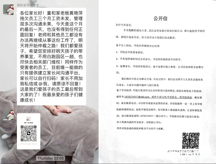 家长徐女士告诉记者,8月31日晚上,童和家员工突然在家长群里发出爆炸性消息:因老板黄某萍拖欠三个月工资,机构即将倒闭,员工准备进行劳动仲裁,并请家长进入维权群向相关部门维权。第二天,人去楼空的校区贴上了正式的闭园公告,老板黄某萍直接失联。