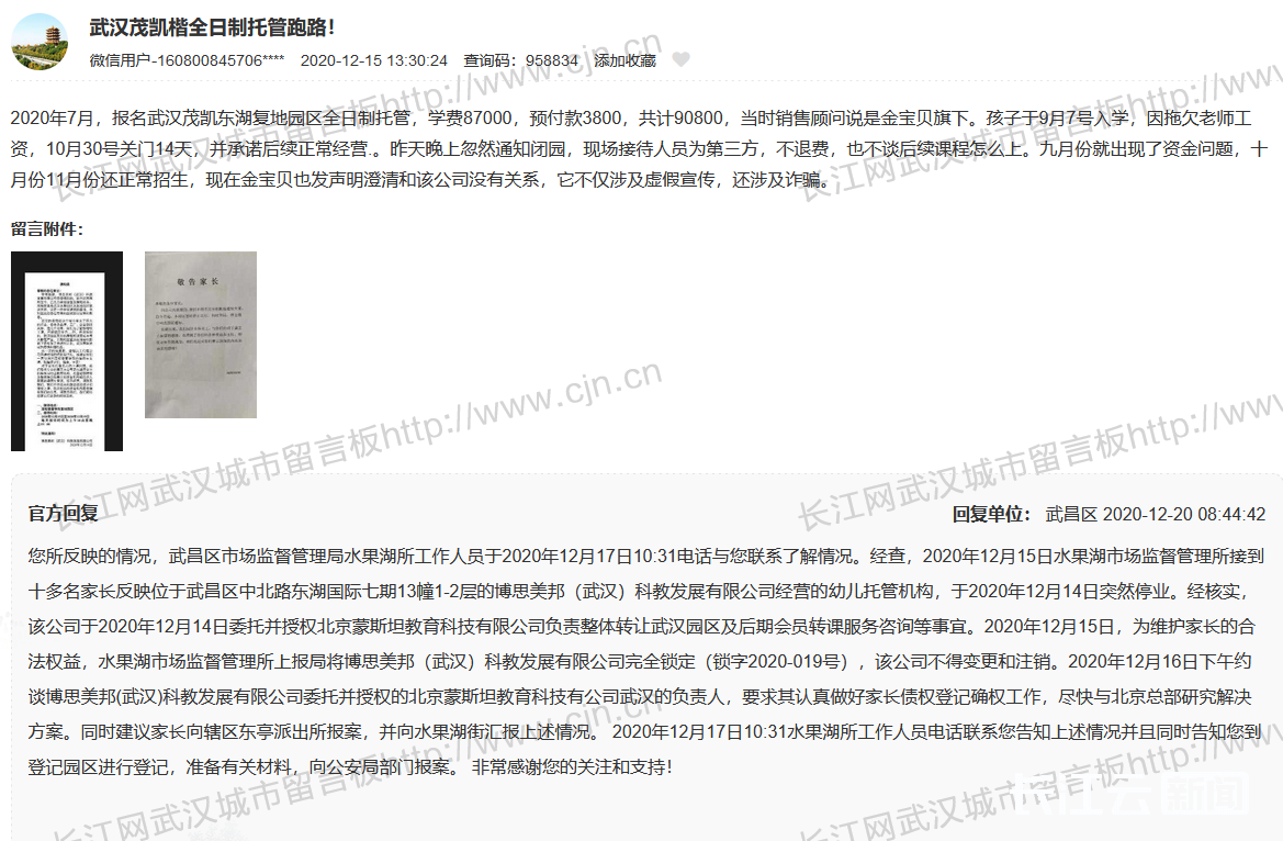当时,监管部门将经营该机构的博思美邦(武汉)科教发展有限公司完全锁定,令该公司不得变更和注销,并列入经营异常登记名录,同时建议家长向辖区东亭派出所报案。