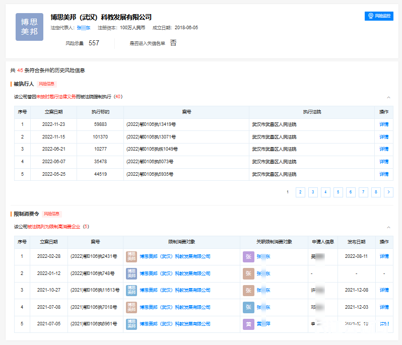 黄某萍等人均在2021年被武汉市武昌区人民法院采取限制消费措施,博思美邦也因劳动争议被法院强制执行。