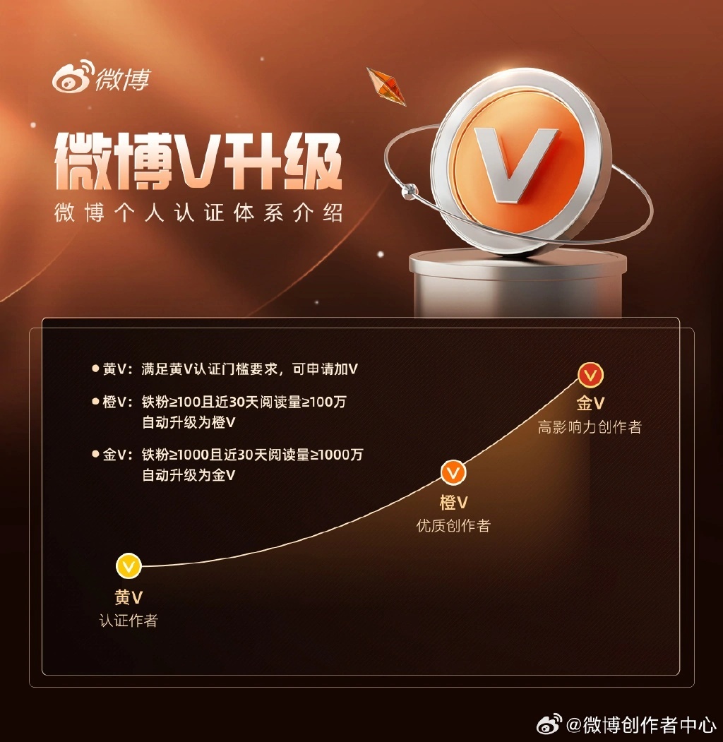 升级完成后,面向创作者将包括金 V、橙 V、黄 V 三层标识体系,对账号的影响力和账号价值进行呈现,微博将会持续完善认证体系,帮助优质创作者获得更多成长和激励,衷心感谢创作者们对微博的支持。