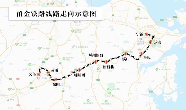 甬金铁路东起甬台温铁路云龙站,途经宁波市、绍兴市,向西终至沪昆铁路金华市义乌站,新建正线全长约188.3公里,全线设云龙、奉化、溪口、新昌北、嵊州新昌、嵊州西、东阳北、苏溪、义乌9个车站,设计时速160公里,预留200公里时速条件,为双线客货共线的I级电气化铁路。甬金铁路双层高箱集装箱运输试验段起自嵊州新昌站,经嵊州西站至东阳北站,全长60.82公里。