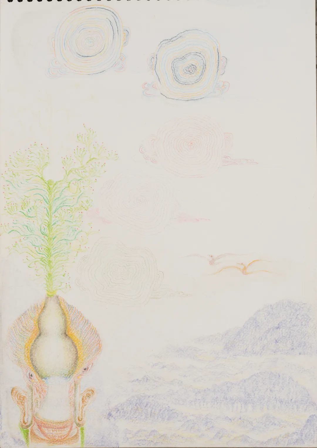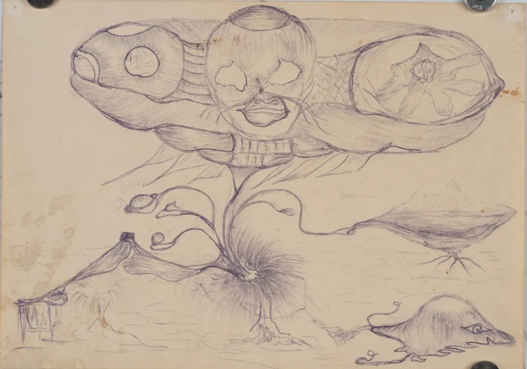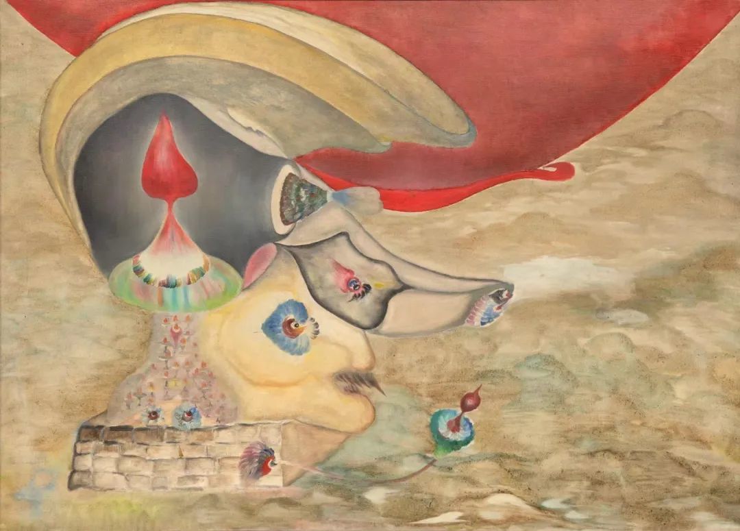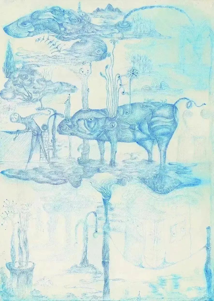 这种风格容易让人联想起“超现实主义”的绘画,但与其略有不同的是,超现实主义仍然倾向于强调一种符号性的意指关系,然而老五的绘画扔掉了某种对应结构和解释框架。有时候一颗植物也会化身成一个完整的世界图景、变成云气缭绕的仙山。