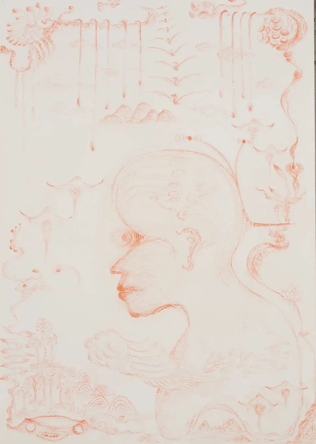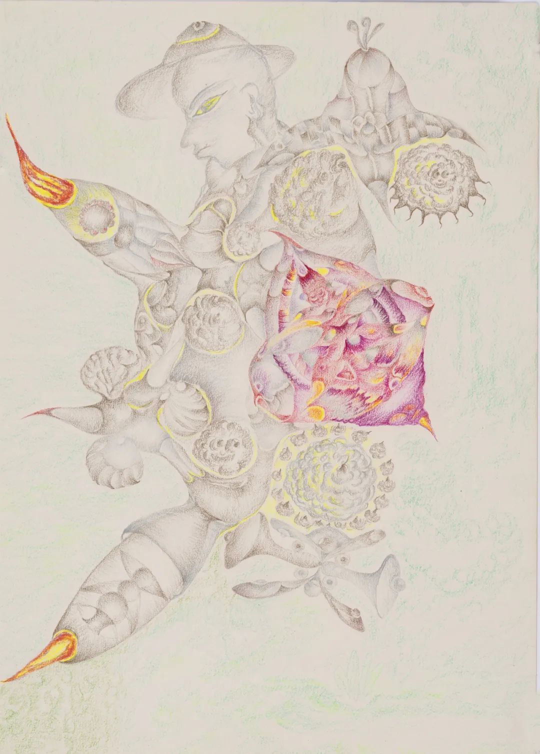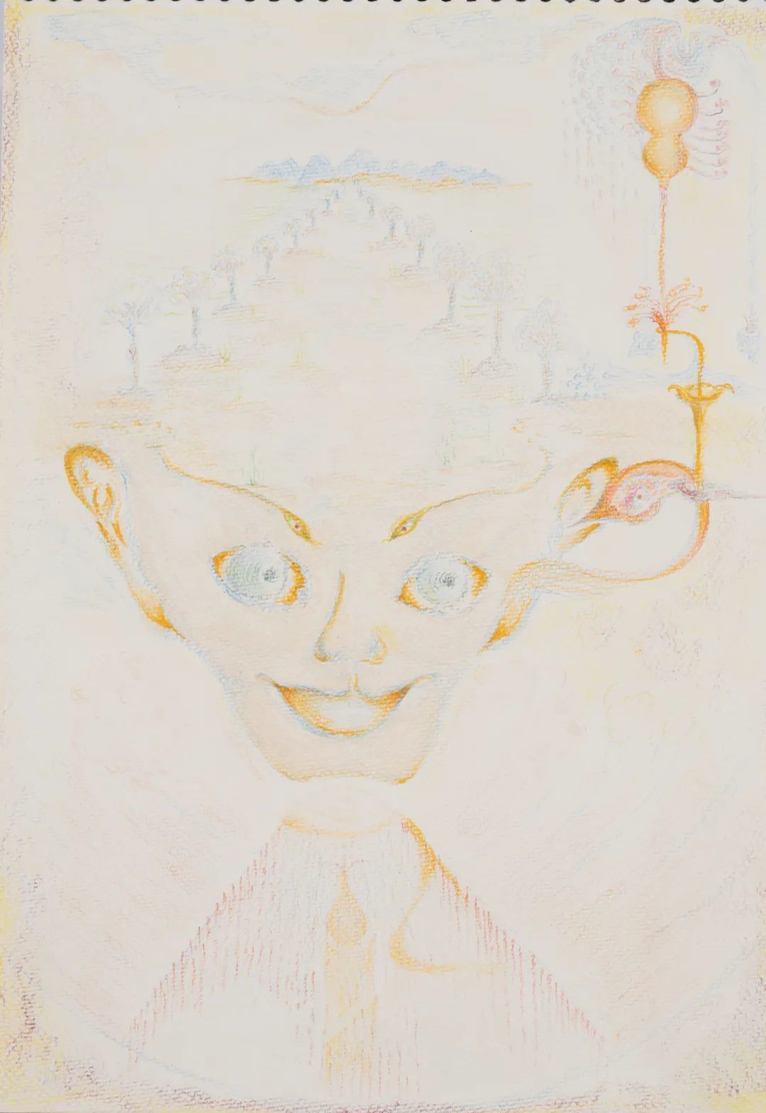 这种风格容易让人联想起“超现实主义”的绘画,但与其略有不同的是,超现实主义仍然倾向于强调一种符号性的意指关系,然而老五的绘画扔掉了某种对应结构和解释框架。有时候一颗植物也会化身成一个完整的世界图景、变成云气缭绕的仙山。