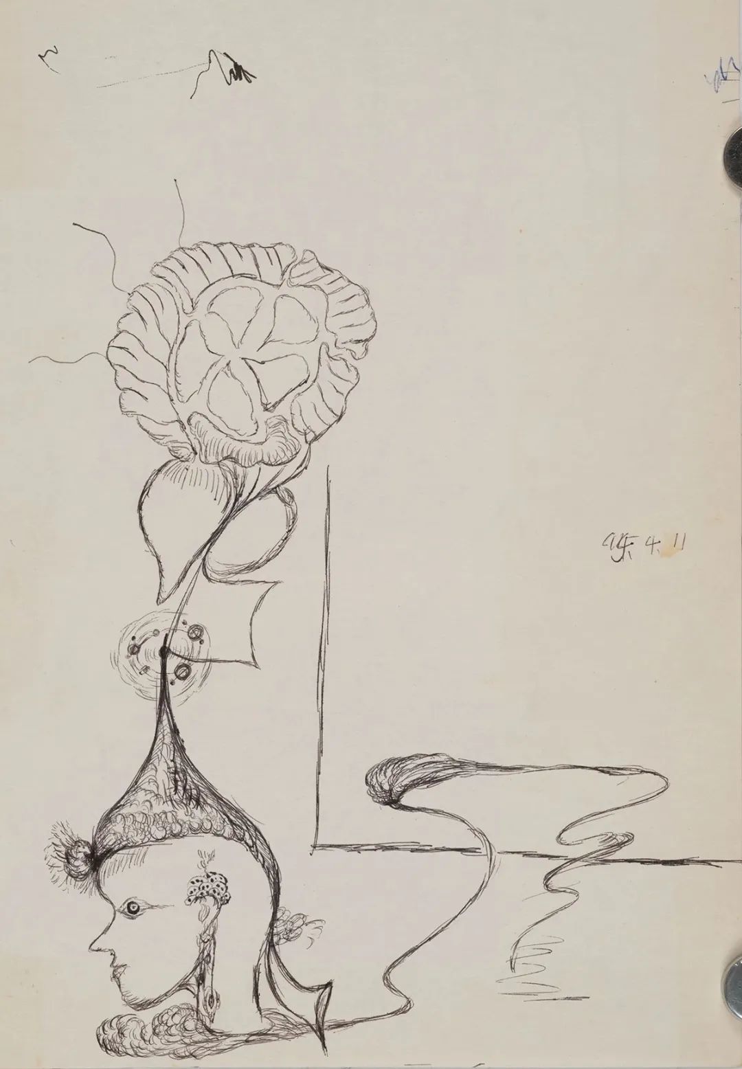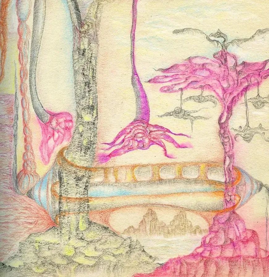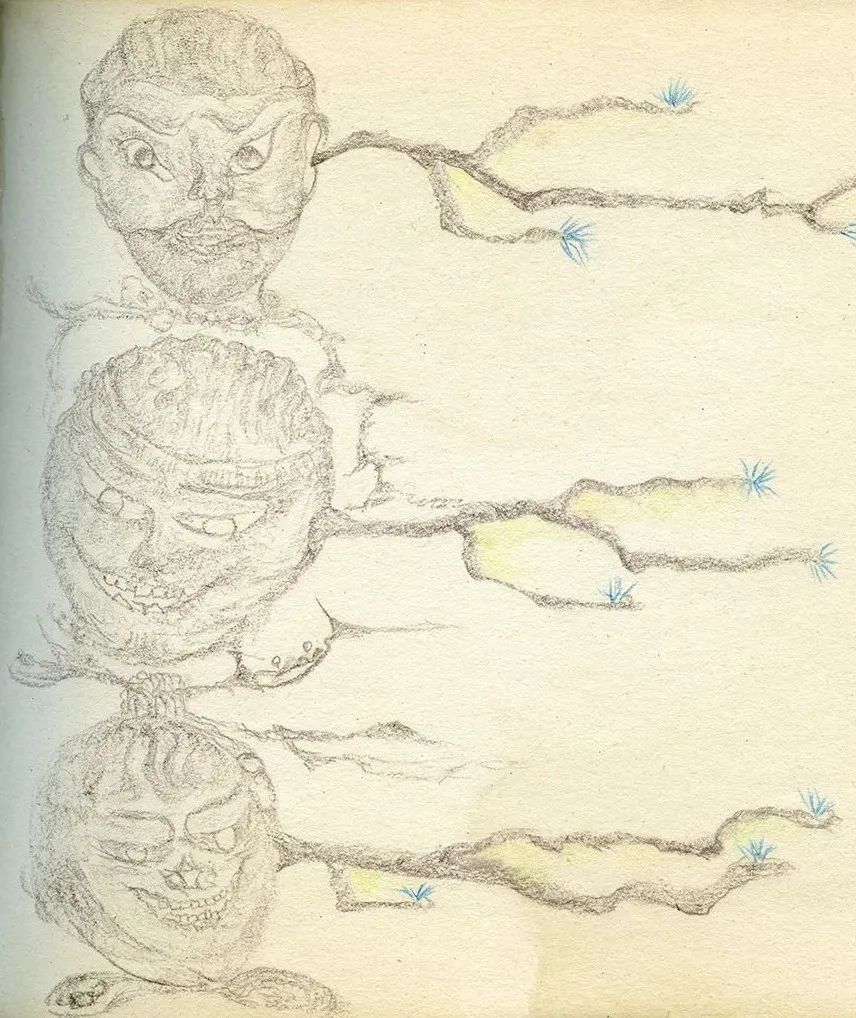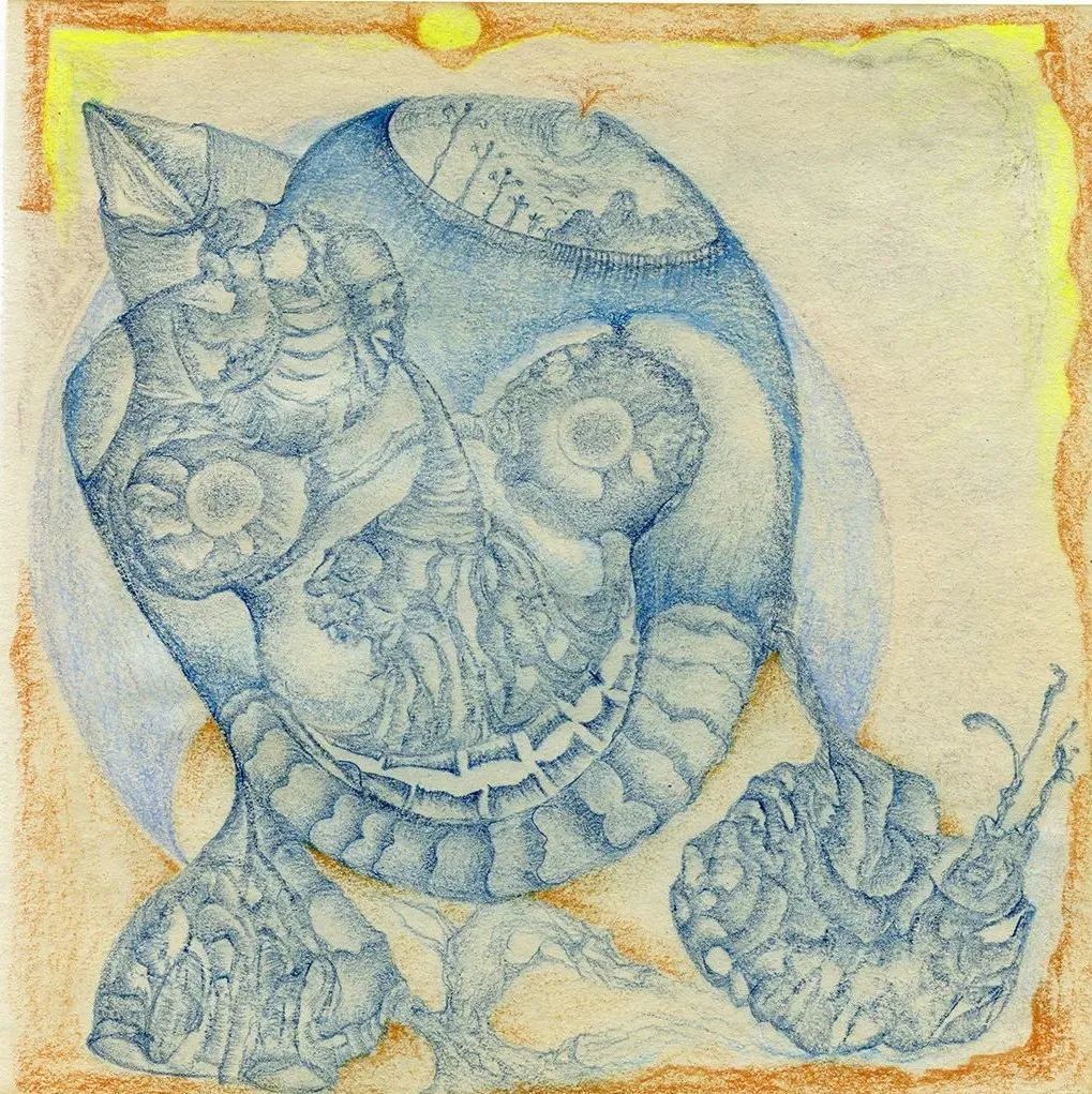 老五的画面里是一个独立的、旷阔的泛灵论的世界。植物的枝蔓变身成为昆虫的触角,向画面的四处延伸,线条拥有了类似交感神经元一样的触觉构件。它们像是德勒兹所说的“块茎”,它是去中心化的、生成的、自由而无约束的野性。