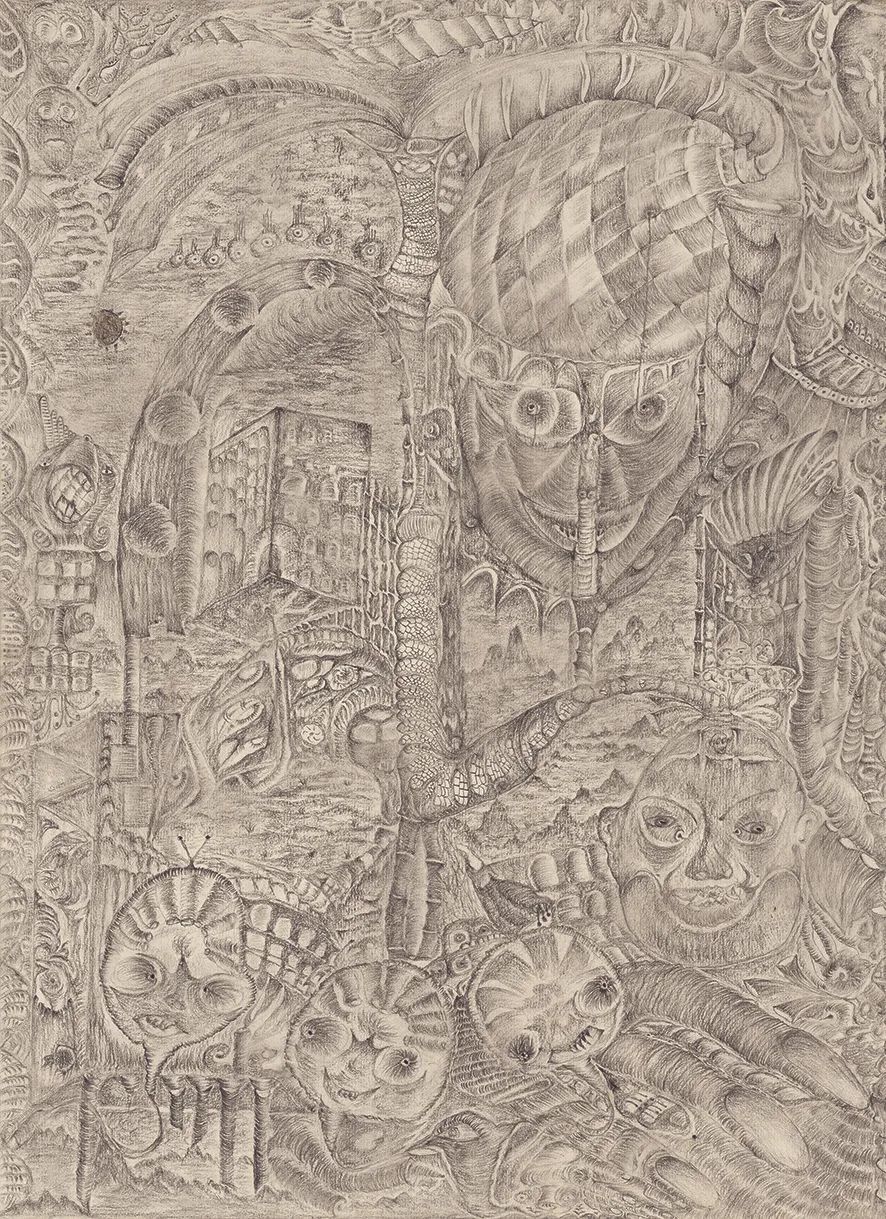 老五的好友陈文波评价老五的绘画有一种“纯真”,它“从一个局部慢慢生发”。这里有某种偶然的丰富性:老五挣脱了预先的构图阶段,因为构图已经是一种约束——它框定了内容,也局限了形式的探索。“生发”式的绘画,是一种向着未知的敞开、将主体抛入一种不可测的状况之中、让线条的发展引领着画家的手与心。这近似于一种老五所向往的、犹如印度秘境的朝向灵性的旅程:它抛弃“我执”,丢掉知识性的内容,任由想象力与心性驰骋。