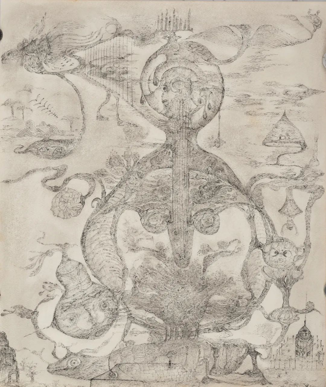 这正是为何,老五的绘画中既有人文山水、又有机械想象,既有凤鸟、也有异形。他纵观古今,无论西东,这正如同大众所熟悉的“唐朝乐队”的音乐:手持电吉他如同舞剑,音符则是律诗,演奏时的状态像是李白饮下了一壶烈酒,他同时看见菊花与月光。