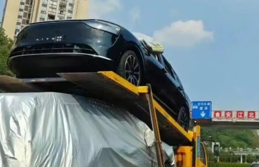 图中的问界M9被放在拖车上,仰视的角度能看到它的车头的下半部分,造型还是比较圆润的,大面积采用封闭式处理,不过下方还是预留了一道进气口,所以猜测该车为增程版。大灯也比较规整,没有攻击感。