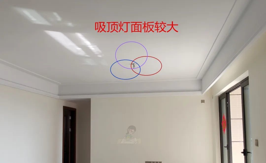 其次,装吸顶灯灯罩较大,调整位置也有较大的操作空间,只要把灯线控制在灯罩面板里面,灯具的位置就可以灵活调整了。