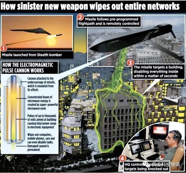 早在1991年海湾战争期间,美军就使用了电磁脉冲武器。美军利用一枚携带HPM(高功率微波)战斗部的战斧巡航导弹,在低空沿着预先确定的路径飞行,发射定向能脉冲,破坏了伊军的防空雷达,伊拉克军队的防空高射炮只能对着空中盲目扫射。在2003年伊拉克战争中,美军又使用电磁脉冲炸弹轰炸伊拉克,造成巴格达地区大面积停电,伊拉克国家电视台信号中断,雷达、电脑、媒体和通信设施陷入瘫痪。