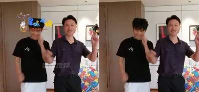 他和小杨哥一起表演捂嘴、对口型唱歌。