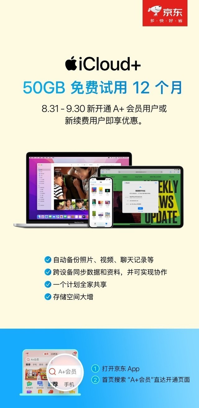 9月6日,京东A+会员限时上线新权益,在京东APP搜索“A+会员”,开通Apple产品京东自营旗舰店A+会员可免费获赠送价值72元的12个月iCloud+50GB会员,这是Apple品牌首次将iCloud+云空间授权给经销商作为会员权益使用,再次体现京东与Apple品牌之间的深度合作关系。