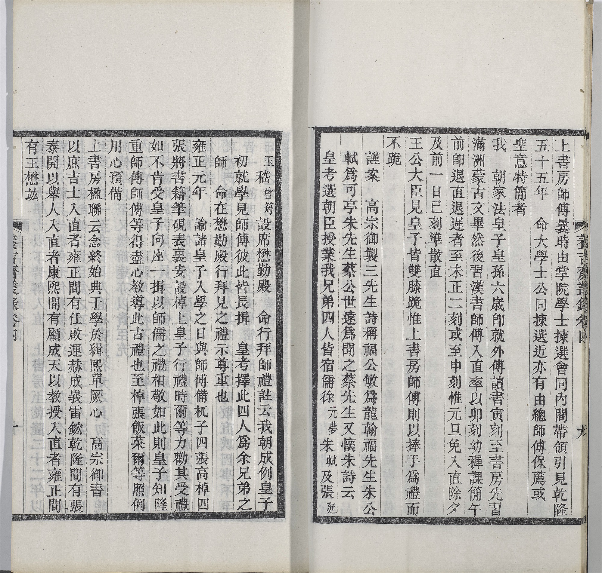 清代,上书房师傅与总师傅,即便不是翰林出身,至少是进士出身,学问优长的饱学之士,方能充任;而且都是皇帝特简。展件选列嵇璜、王杰,潘世恩、穆彰阿,翁同龢,李鸿藻等人充任上书房总师傅之事。其中《高宗实录》一件,记载了“师傅不进书房议处事”:乾隆五十四年三月间,连续六天,上书房从总师傅到师傅都没有进入上书房,因此都被议处了。从这件事可以看出,清代皇帝对于阿哥们学习的重视。