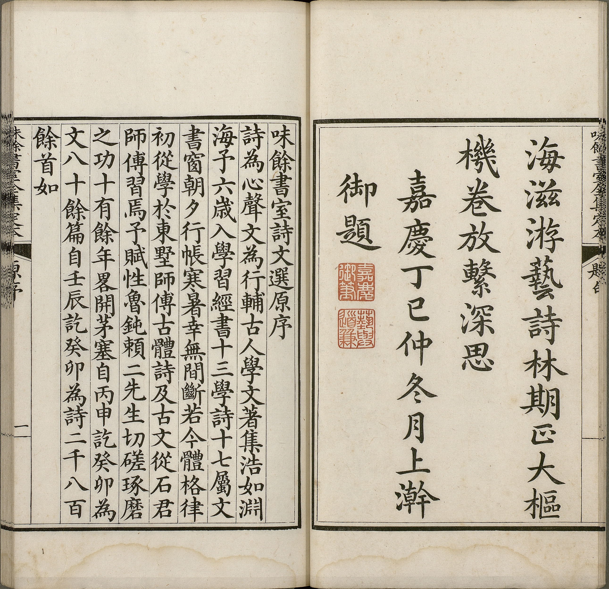 《味馀书室全集定本》〈味馀书室诗文选原序〉清 仁宗撰;庆桂等奉敕编《味馀书室全集定本》卷一(第一册)清嘉庆六年武英殿刊本,台北故宫博物院藏