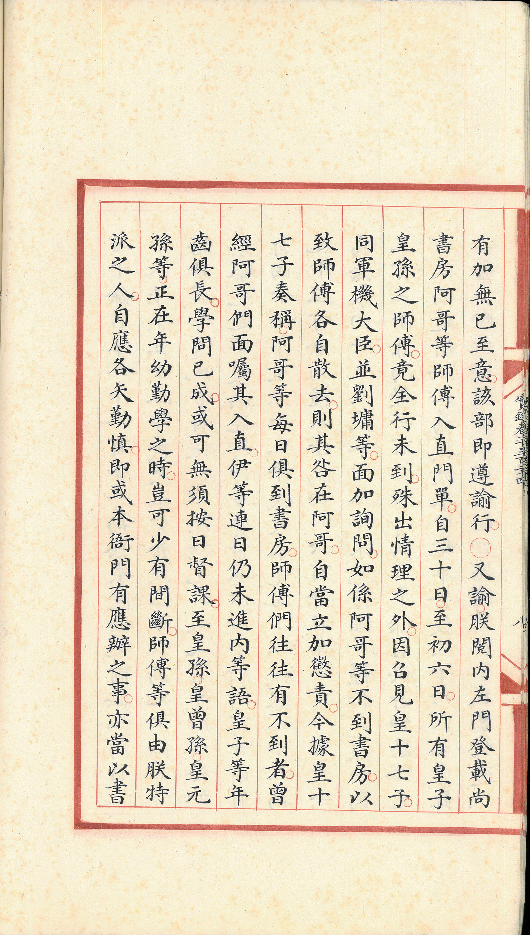 清代上书房(或称尚书房、阿哥书房)制度始设于雍正年间,是阿哥上学的场所。阿哥学习时光从六岁至十五岁,相当于现今小学至中学阶段,即使已分封为亲王、贝勒,仍须入书房就学。每日清晨寅时(三至五时)进入书房,先学习拉弓、习满语及蒙语;接着从卯时(五至七时)起学汉文典籍,直到傍晚放学。放学后练骑射、背诵满蒙语文、复习汉文等,学习生活充实而紧凑。