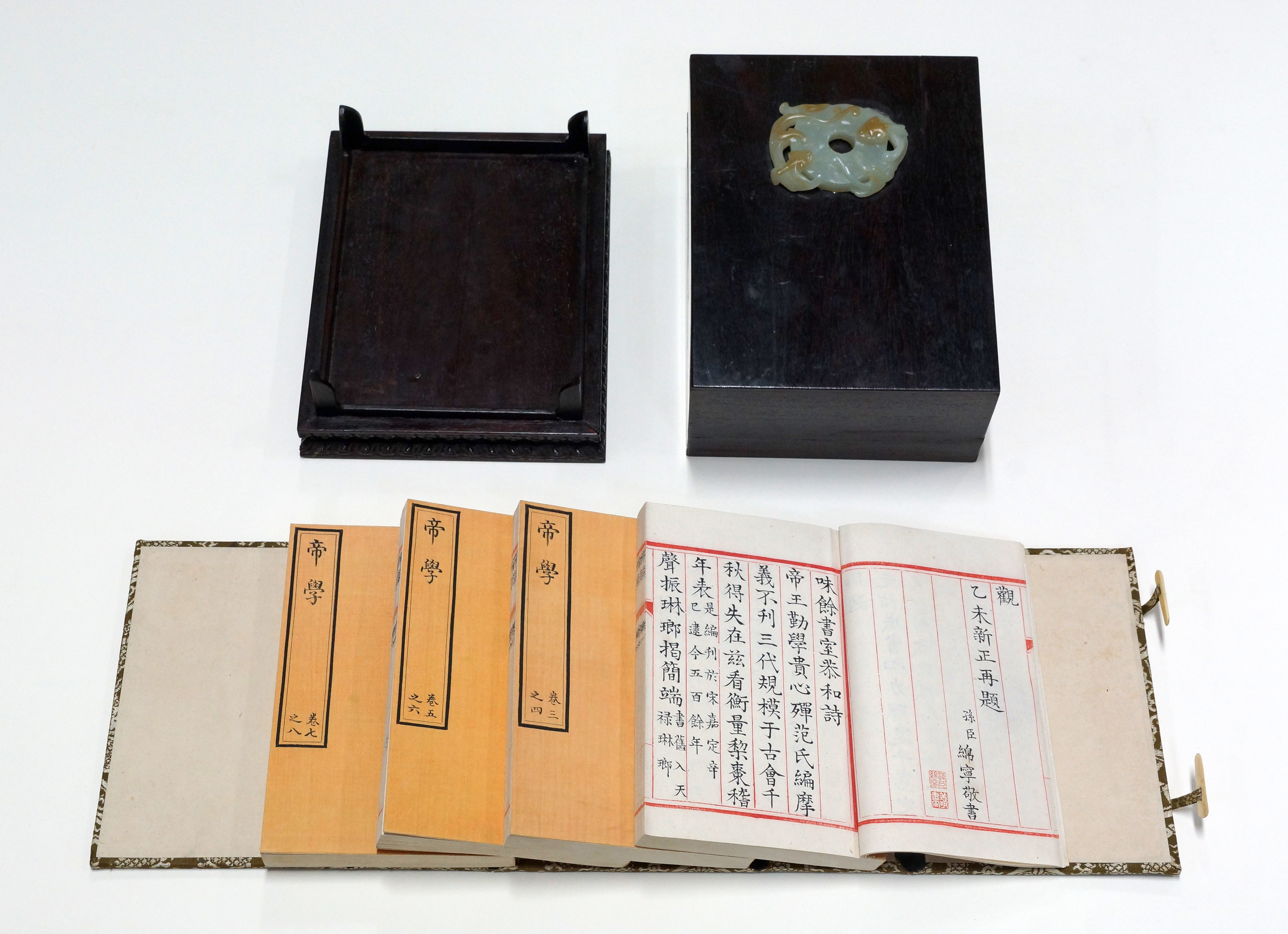 院藏清宫根据明代书籍绘制或重印的《帝鉴图说》与《养正图解》等书,以生动之插图,教导阿哥有关中国古代帝王治国事迹,图文并茂,颇能引发学习的兴趣。咸丰十一年(1861)十月《起居注册》记载,《帝鉴图说》被列为同治小皇帝日讲的重要学习教材,之后由祁寯藻及翁同龢二位帝师讲述其中故事。此外,院藏乾隆皇帝下旨命永珹(1739-1777)、永瑆(1752-1823)、永瑢(1744-1790)以及皇孙绵宁(即道光皇帝,1782-1850)抄写宋代范祖禹《帝学》一书。此书正是一部专门讲授历代贤德君主,正心修身、进学修业榜样的历史教科书。藉由缮抄过程,让阿哥们学习成为明君必备的德行。