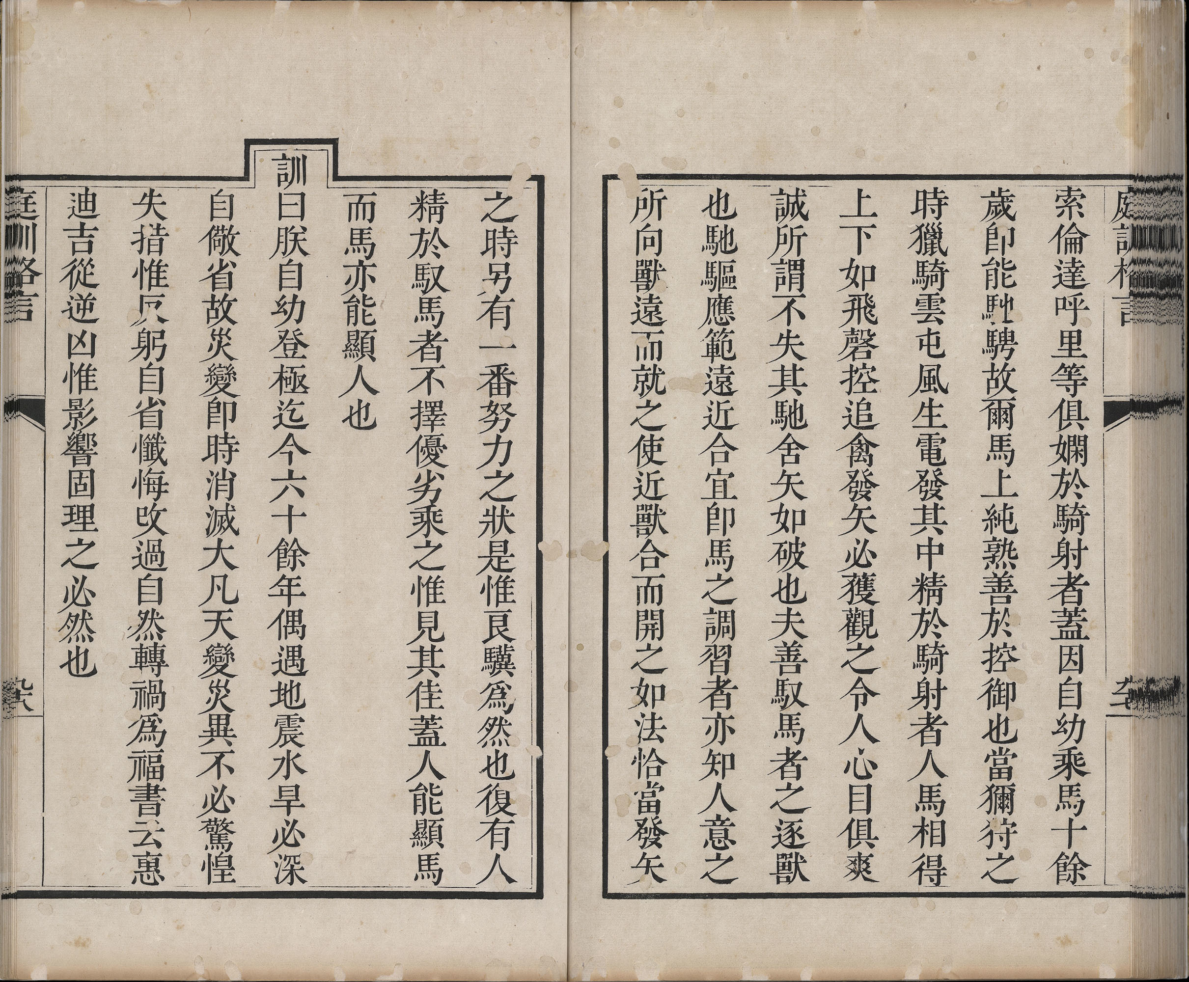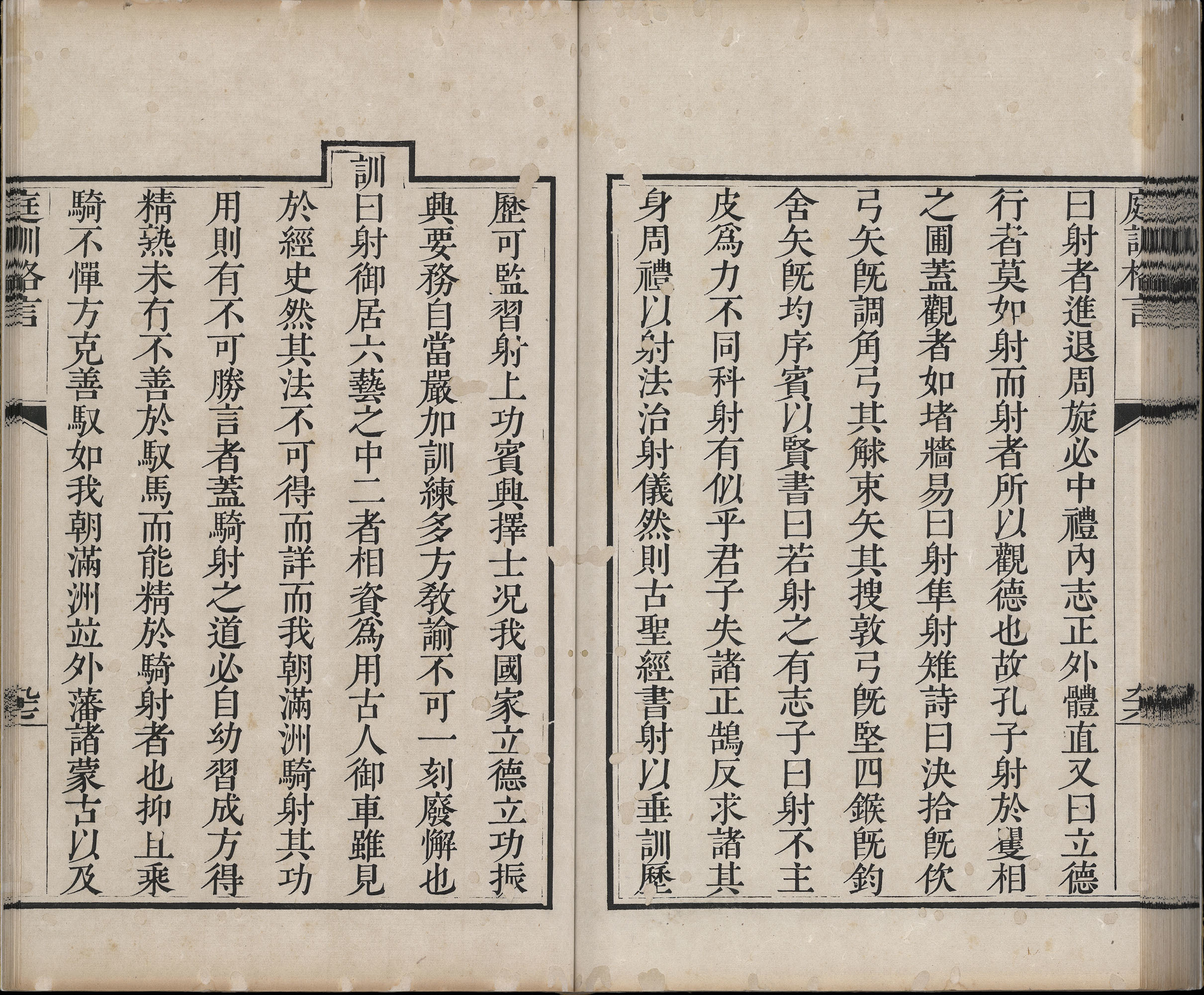 骑射武功,乃满族之传统,骑射技术的优劣取决于骑马技术的熟练程度。阿哥们皆自幼学习拉弓、步射及骑射课程,一般骑射课程安排在诵读经书之后,与学习汉文典籍课程穿插进行。圣祖康熙之骑射技能十分出色,于《庭训格言》中提到:“盖骑射之道,必自幼习成方得精熟,未有不善于驭马而能精于骑射者也。”因此,清朝皇室非常重视阿哥们的骑射训练,必须自幼学习,以达到“人马相得,上下如飞,磬控追禽,发矢必获,观之令人心目俱爽”的程度。