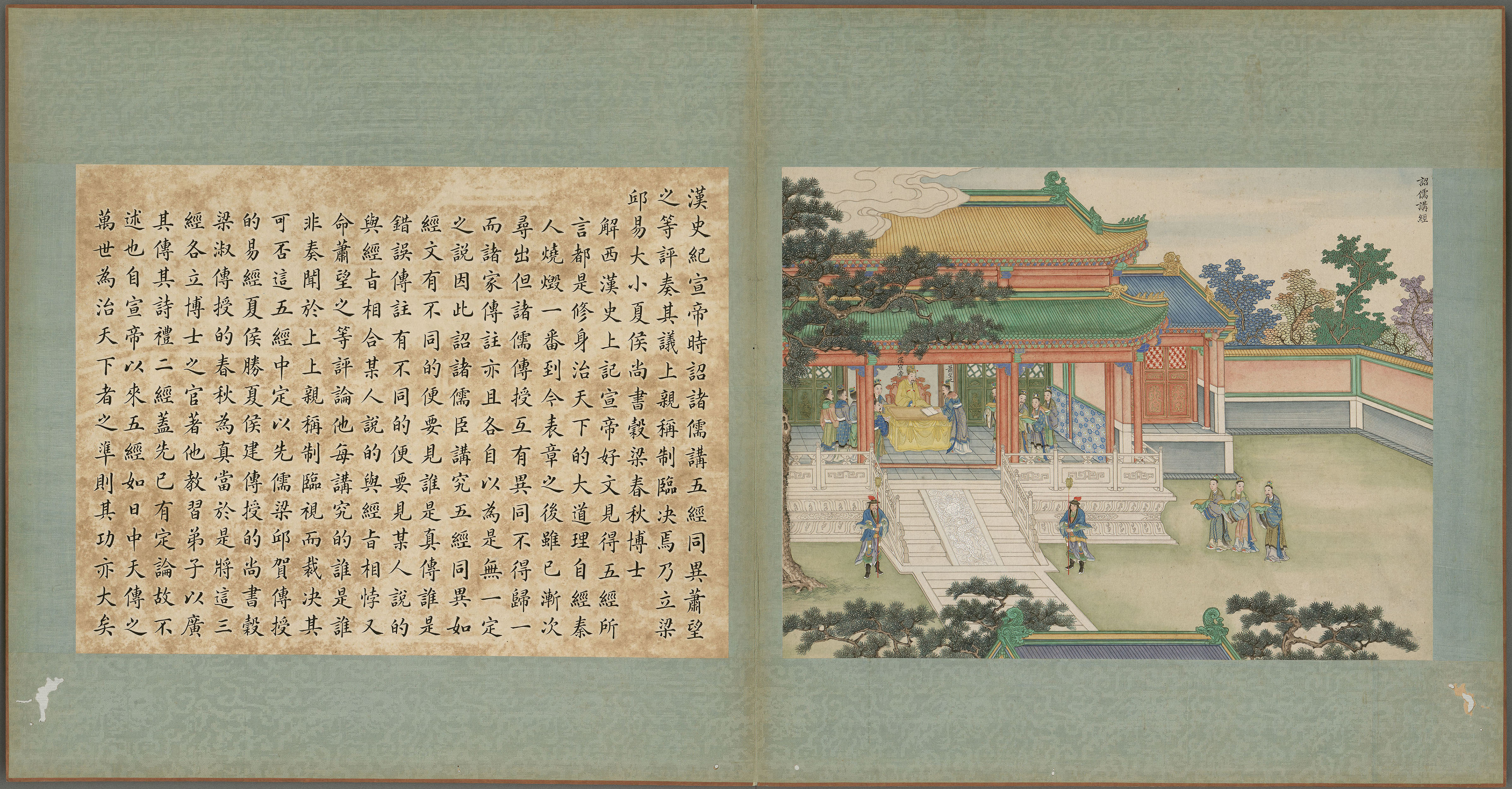 “诏儒讲经”,故事叙述汉宣帝(西元前91-49)诏儒家学者校刊五经(即诗经、尚书、礼记、易经、春秋),另命太子太傅萧望之(西元前?-46)评议,俾使经文趋向统一,成为治天下之准则。清代沿袭中国帝王的传统,于顺治皇帝开启实行经筵、日讲之先河,透过仿效明制的国家大典仪式,讲官编纂讲章,展现帝王崇尚儒学治道之基本国策。