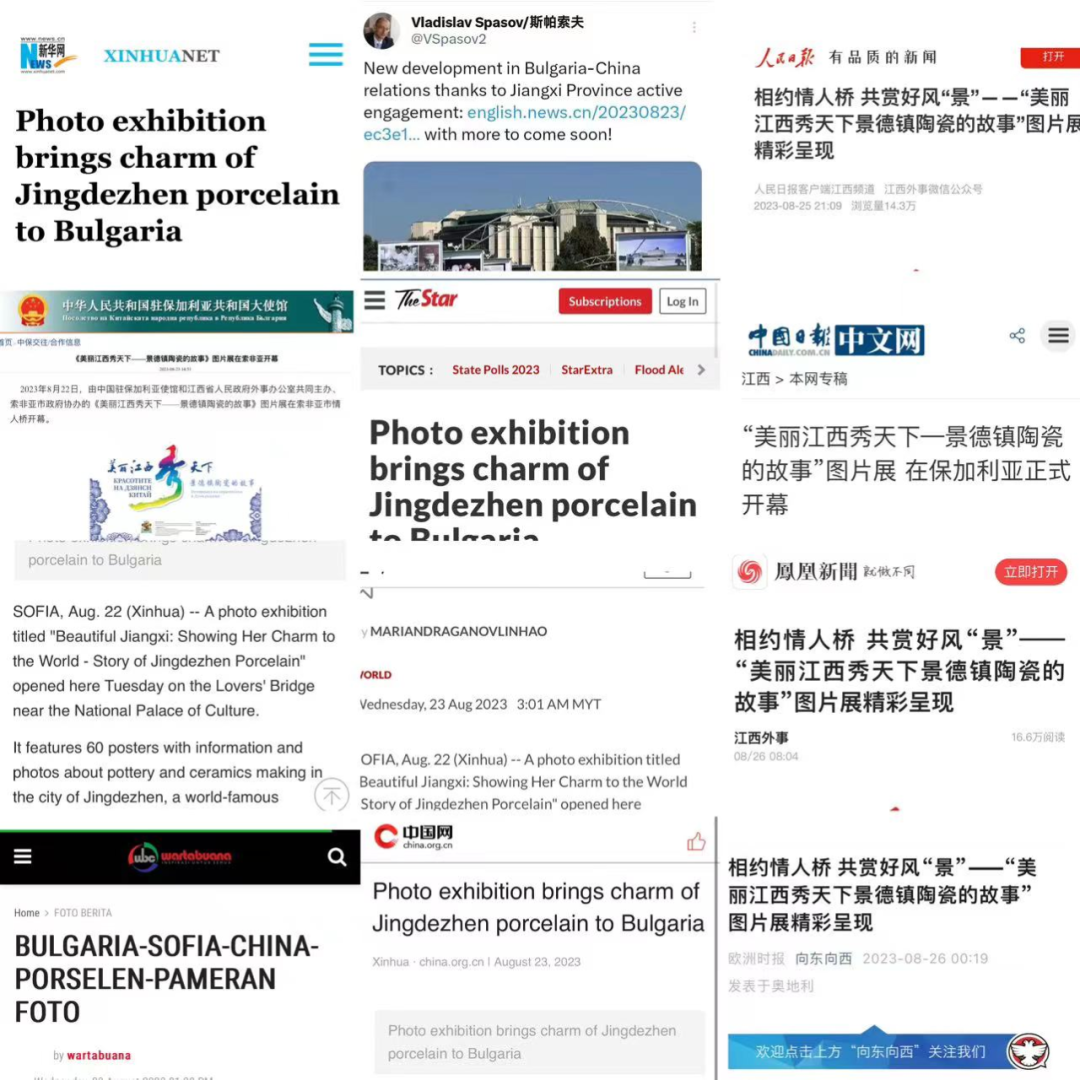 图片展自开幕以来,也引起了中外媒体的广泛关注,人民日报、新华社、中央广电总台、中国日报、中国网、凤凰网、欧洲时报、保加利亚《大地报》、马来西亚《星报》等数十家海内外媒体以及江西发布、大江网、景德镇发布、景德镇广播电视等省内媒体纷纷进行报道或转载。此外,中国驻保加利亚大使馆官网、微信公众号和脸书账号及时推出更新图片展的各类信息,保加利亚多位自媒体人在脸书(Facebook)和推特(Twitter)上推介图片展。