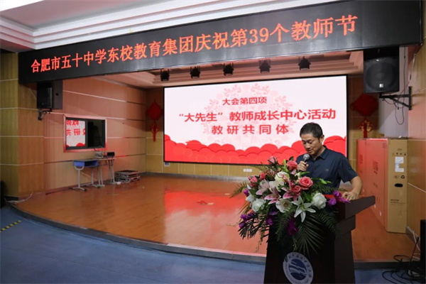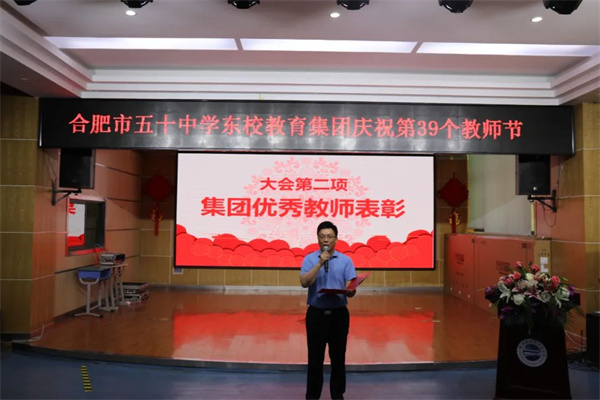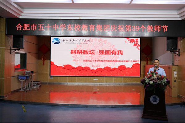 躬耕教坛,丹心一片育桃李;岁月如歌,金秋九月颂师恩。为弘扬师德、歌颂师恩,鼓励先进,在全社会营造尊重人才、尊师重教的浓厚氛围,在全国第39个教师节来临之际,9月6日下午,合肥市五十中学东校教育集团西园校区在报告厅举行“躬耕教坛 强国有我”为主题的教师节庆祝活动,进一步弘扬高尚师德,担当育人使命。蜀山区教体局党委委员、副局长,合肥市五十中学东校教育集团党委书记、校长张斌,合肥市五十中学东校教育集团副校长、西园校区执行校长张曙,西园校区副校长杨俊、李树海,西园校区第一党支部副书记、德育处主任宋奇香,第二党支部副书记、教研处主任王胜等各处室领导及全体教职工参加本次大会。