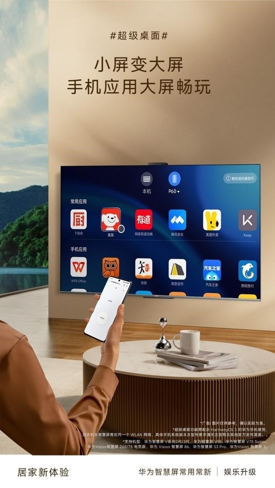 而且,此次更新的华为智慧屏还为有大内存需求的用户准备了一个惊喜——超级桌面,智慧屏可以免安装直接使用手机内的应用,免去了内存不够、频繁下载的烦恼。开启超级桌面之后,我们还可以通过手机端智慧生活APP—智慧屏卡片的触控遥控器刷短视频、打游戏、看攻略等等,智慧交互性和可玩性得到了大幅度提升。除了针对用户在娱乐体验方面的提升外,华为智慧屏更在健康、关怀以及畅连方面也带来了升级,旨在更好地满足用户的一切需求。