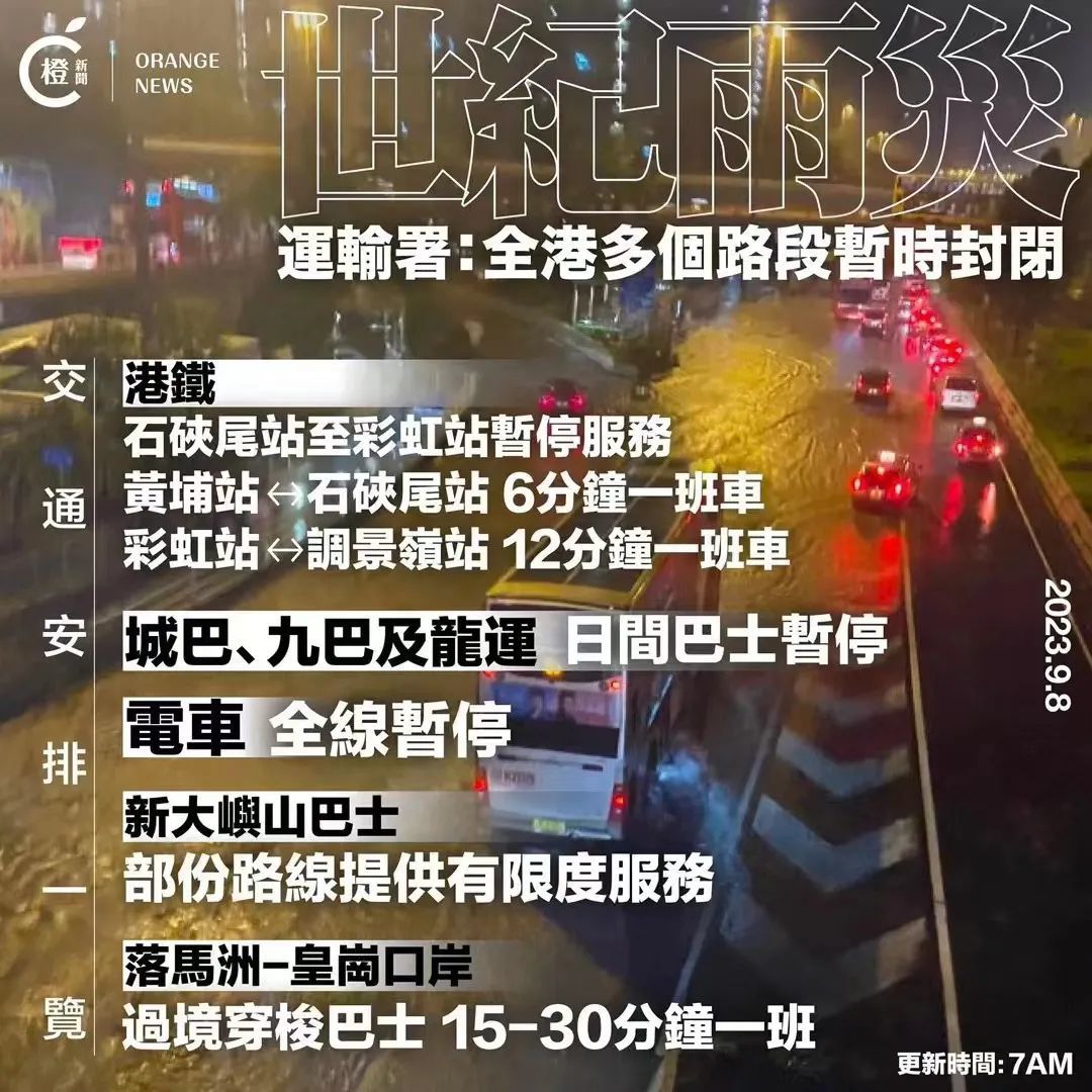 香港天文台7号晚上9点25分发出黄色暴雨警告,25分钟之后改成红色暴雨警告,之后在11点05分,改发黑色暴雨警告信号。全港多个地区交通停摆。