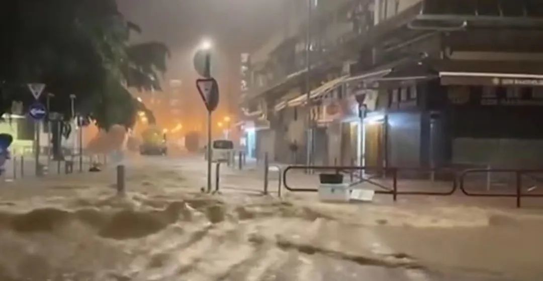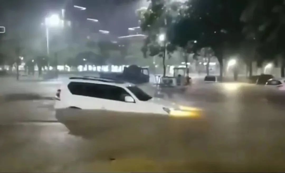 多处严重积水路段,街道已成河流,水深达行人大腿处,车辆几乎完全被淹没。