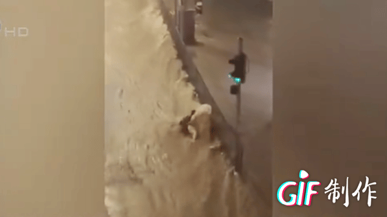 路面积水情况严重,有行人不慎在积水中滑倒并被冲走,情况十分危险。