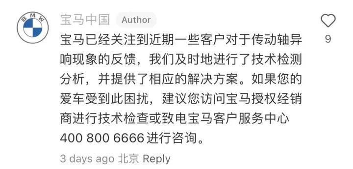 关于多款宝马新车被曝传动轴异响的问题,8月7日,宝马中国小红书官方账号在置顶回复中表示,“宝马已经关注到近期一些客户对于传动轴异响现象的反馈,我们及时地进行了技术检测分析,并提供了相应的解决方案。”