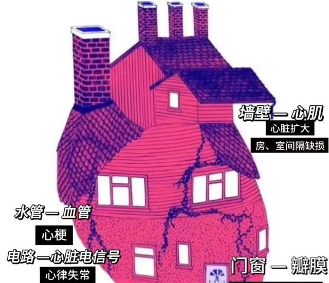 我们把心脏比喻成一间两室两厅的“房子”:左心房、右心房、左心室、右心室。每个房间都配备了门窗“瓣膜”、墙壁(心肌)、电路(心脏电信号)、水管(血管)四套系统。“房子”如果出现的毛病,大部分和以上四个系统有关系。