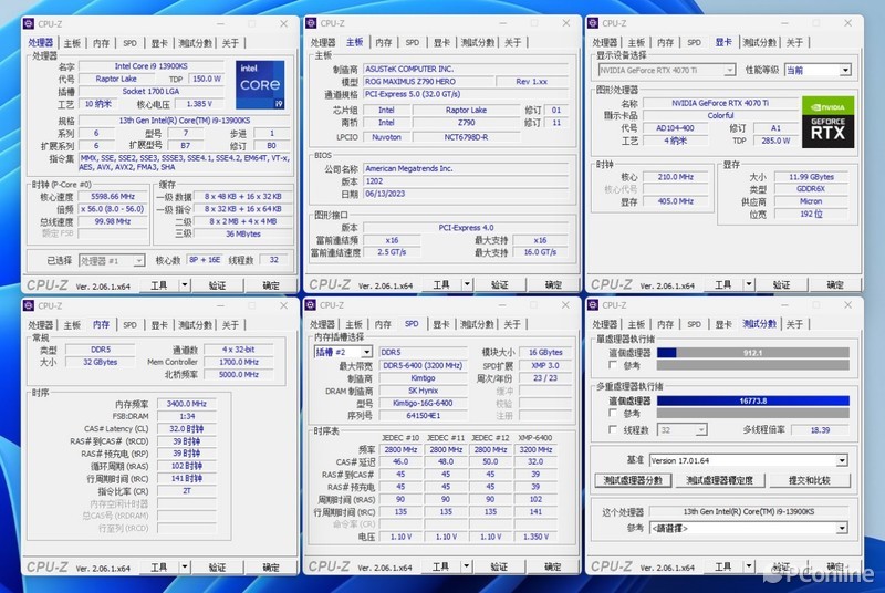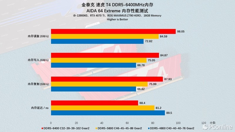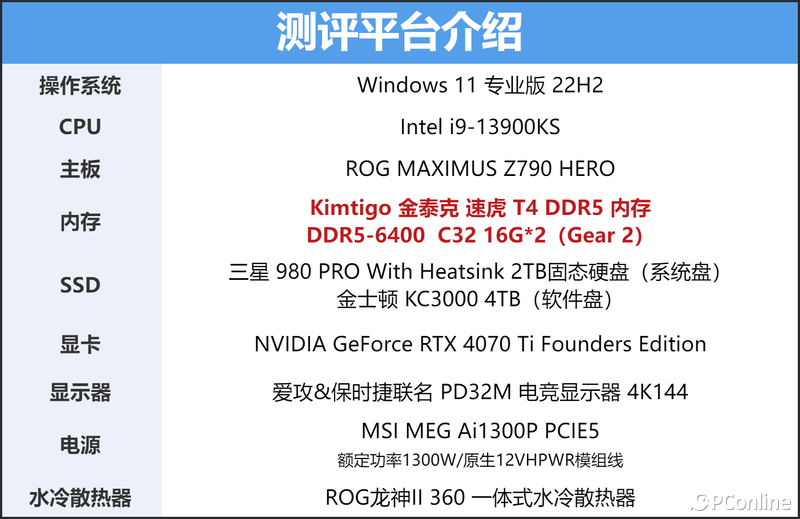 测试平台我们采用了目前评测室中镇室之宝,处理器为i9-13900KS,主板为ROG MAXIMUS Z790 HERO,显卡为NVIDIA GeForce RTX 4070 Ti,这样的配置完全可以发挥出金泰克 速虎T4 DDR5-6400MHz内存的潜力。