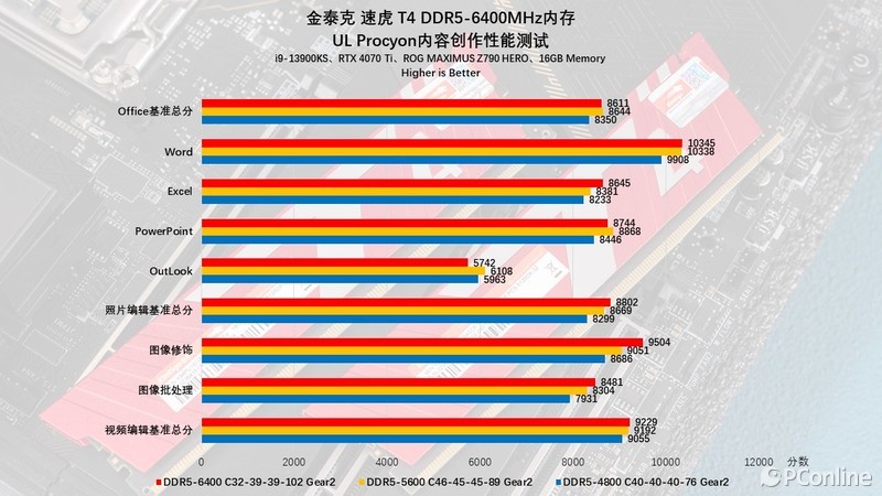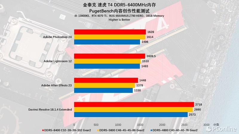 创意生产力方面我们还测了UL Procyon,金泰克 速虎T4 DDR5-6400MHz在UL Procyon内容创作性能中的表现与Puget Bench测试基本是一样,高频低时序的优势依旧明显,能够对整机性能有着明显的影响。