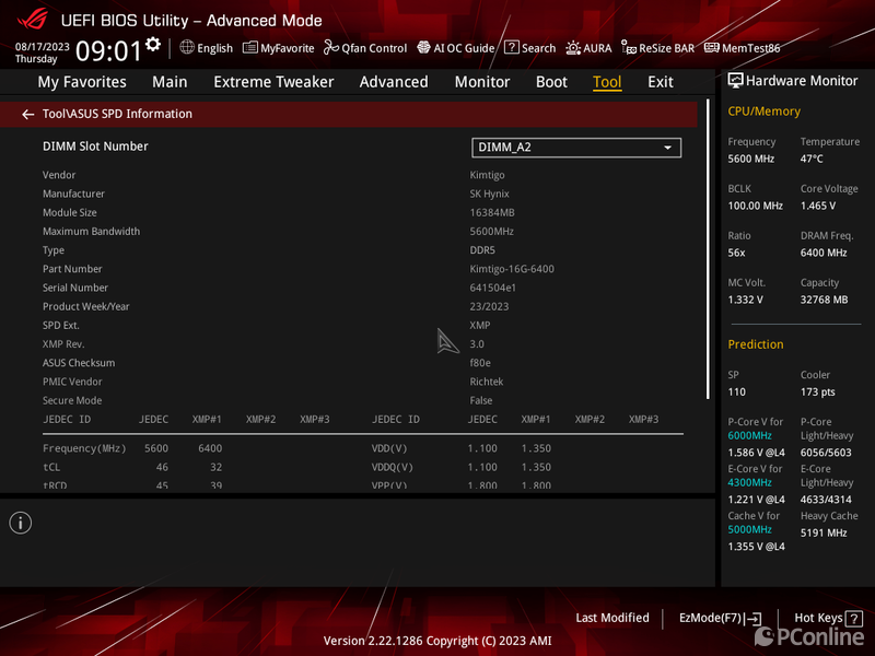 测试之前我们先到主板BIOS中查看一下金泰克 速虎T4 DDR5-6400MHz的信息,生产厂商为Kimtigo金泰克,颗粒厂商为SK Hynix,支持INTEL最新的XMP 3.0技术,PMIC厂商为Richtek。