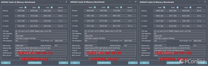 当然了,内存频率的高低最主要的还是体现在内存带宽上,在AIDA64内存基准测试里面,我们首先测试了DDR5的标准起步频率4800MHz,金泰克 速虎T4 DDR5-6400MHz内存在4800MHz下的读取、写入、复制以及延时成绩分别为74565 MB/s、68382 MB/s、68426 MB/s以及89.5 ns。整体的性能表现要高于DDR4级别的内存性能表现。5600MHz下,延迟稍稍降低,而读取、写入、复制等性能则来到了76000-86000MB/s之间,整整高出4800MHz时10000MB/s。