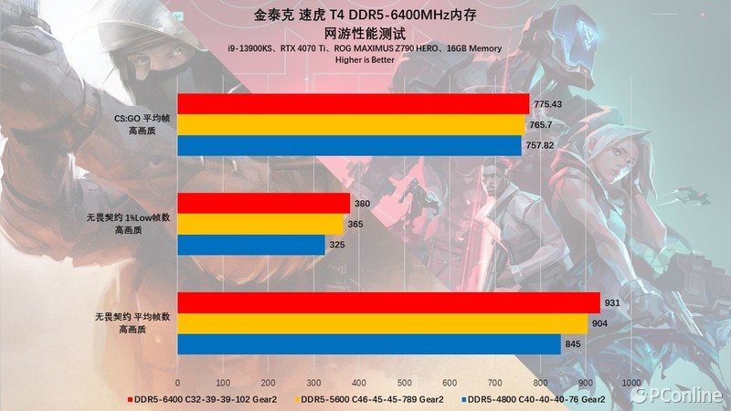 最明显的就是《无畏契约》了,高频下,无论是平均帧还是1%Low帧都有10%的提升!因此喜欢玩网游的用户可以升级自己的内存成金泰克 速虎T4 DDR5-6400MHz,高频低时序的表现相信能让你的游戏体验更进一步。