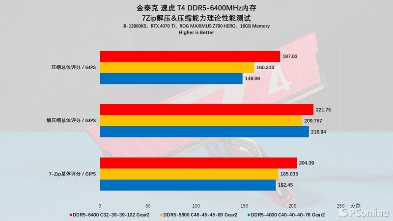 内存频率的高低对CPU的性能也有影响,最直观的就是看数据的压缩与解压缩,使用7-Zip对金泰克 速虎T4 DDR5-6400MHz内存进行测试,在标准4800MHz频率时,压缩测试得分为148.06 GIPS,解压缩测试得分为216.84 GIPS,整体测试得分为182.45 GIPS。小幅提升至5600MHz后,压缩性能在4800MHz的基础上又提升了8%。如果你开启XMP后,你会发现,分数还能进一步提升到压缩187.03 GIPS,解压缩221.75 GIPS,总分204.39 GIPS,提升幅度明显。