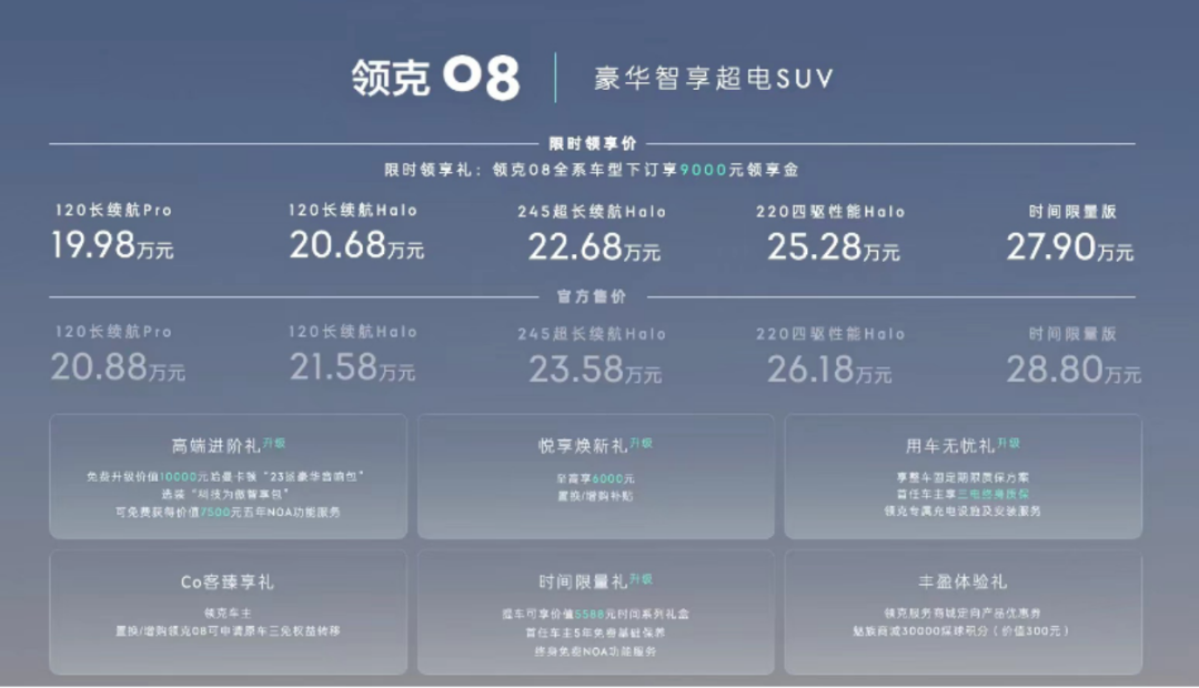 于是身为“次旗舰”的领克08,反倒更吊人胃口。20.88~28.80万元(限时19.98~27.90万元)的定价,刚好充实了01和09之间空白。