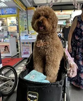 网友在集市上偶遇了一只可爱的巨型贵宾犬,只见狗子乖乖坐在推车上,陪着主人买菜,看起来可爱又威风。