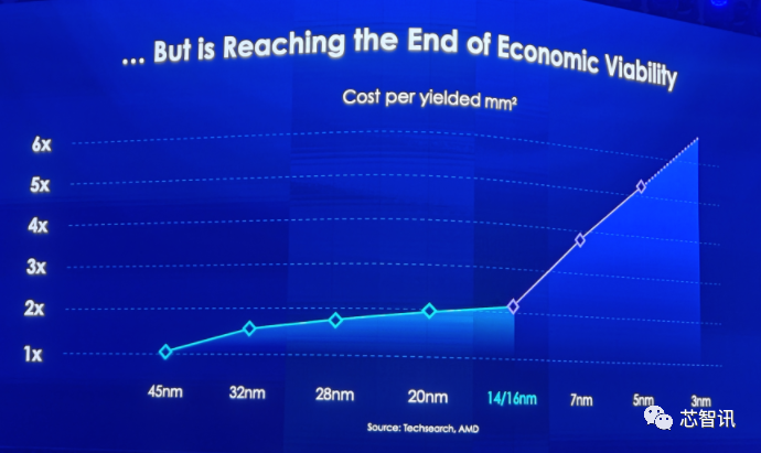 从芯片制程技术来看,随着摩尔定律推进的放缓,制程工艺的“微缩”变得越来越困难,并且从14/16nm开始,随着制程工艺的升级,单位面积的芯片成本开始快速飙升。虽然通过异质整合、先进封装(2.5D/3D封装)技术依然可以继续推动单位面积下晶体管的数量的增长(在谈到高性能芯片3D化趋势时,Sassine Ghazi说未来3D芯片占比将会达到40%),但是芯片的多维度复杂性也越来越高,这对于芯片产业来说将是巨大的挑战。