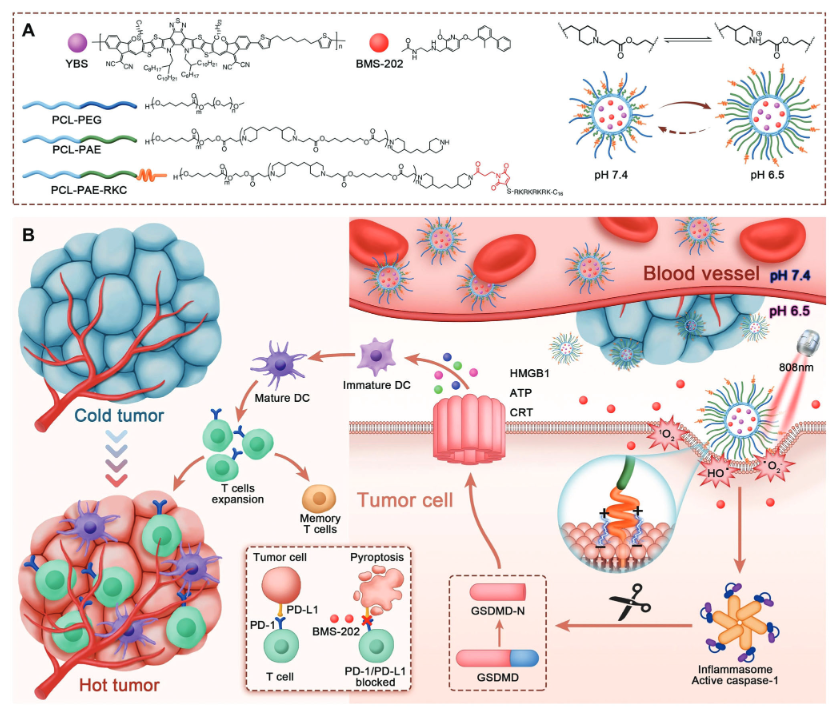 近年来,苏州大学李盛亮课题组通过调控近红外光学药物的分子结构与构效关系,发展了一系列具有癌症光疗能力的药物,并取得了高效的光学治疗效果(Adv. Mater. 2023, 10.1002/adma.202306492;Adv. Mater. 2023, 35, 2211632;Adv. Mater. 2022, 34, 2201263;Adv. Mater. 2022, 34, 2204749;Adv. Mater. 2021, 33, 2102799;ACS Nano 2022, 16, 12480;Angew. Chem. Int. Ed. 2021, 133, 11864;Adv. Mater. 2020, 32, 2001146)。在上述工作基础上,该团队近期与苏大附一院侯建全教授、张卫杰教授团队合作开发了一种集免疫原性焦亡和免疫检查点阻断于一体的PH响应性纳米光敏剂(YBS-BMS NPs-RKC)。以细胞膜锚定肽RKC修饰的pH响应聚合物为载体,包封近红外激活半导体聚合物光敏剂YBS和PD-1/PD-L1复合物小分子抑制剂BMS-202,证明了pH驱动的YBS-BMS NPs-RKC的膜锚定和焦亡活化。体外和体内研究表明,这一联合疗法可刺激强大的抗肿瘤免疫反应,抑制原发性肿瘤进展,并唤起长期免疫记忆以抑制肿瘤复发和转移。该研究为PCa免疫治疗提供了一个高效的协同作用平台,并为开发更具生物相容性的光控焦亡诱导剂提供了新思路。