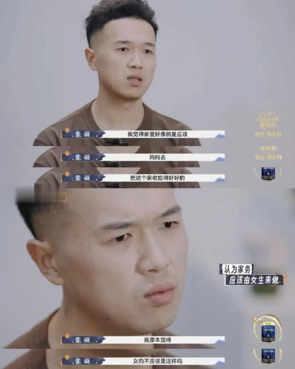 而镜头给到张硕,他竟然还在说”妈妈把这个家收拾好,女的不就应该这样吗”。