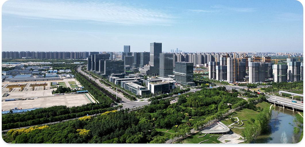 园区紧邻西太路生态绿廊,南侧为洨河生态公园与秦岭群山,远山含黛,溪水平缓,郁郁葱葱。