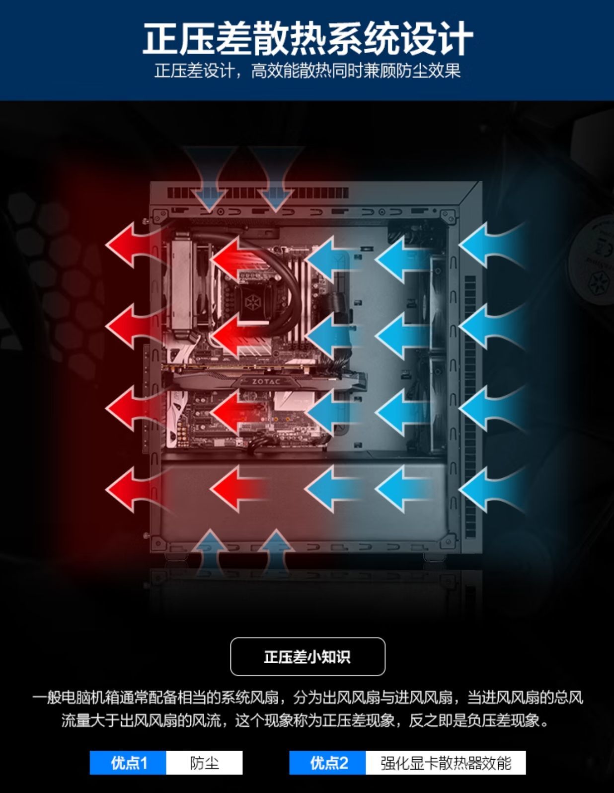 散热风扇位置方面,前面位置可安装三个120/140风扇,标配两个140风扇,支持120/140/240/280/360水冷;顶部位置可安装两个120/140风扇,支持120/240水冷;后置位置可安装一个120/140风扇,标配一个140风扇,支持120/140水冷。为了兼顾高效能散热与防尘,机箱还采用了正压差散热系统设计,官方示意图给出了前进、上进、下进、后出的风扇安装方式。