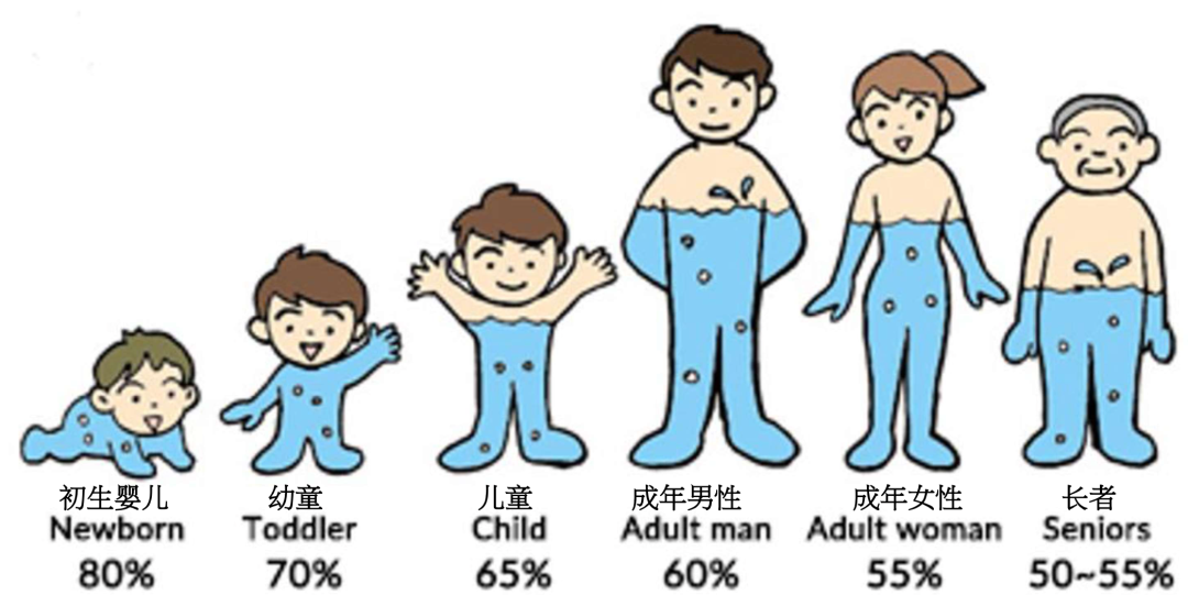 先说一个反常识的,因为一句“女人是水做的,男人是泥做的”,让很多人误以为女性身上的含水量比男性高。但其实成年男性身体的水分更多,分别占身体的60%和55%。人体的水分随着年龄增长而减少,初生的孩子最多有80%,老年人只有50%。