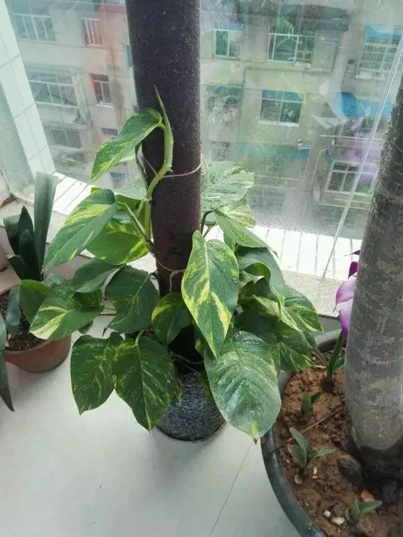 龟背竹、绿萝和合果芋等植物都会在生长节点处长出气生根,气生根有缠绕和固定的作用,可以攀爬在柱子向上攀爬,而且越是网上生长,它们的叶子就会越长越大,这个也是非常奇特的。