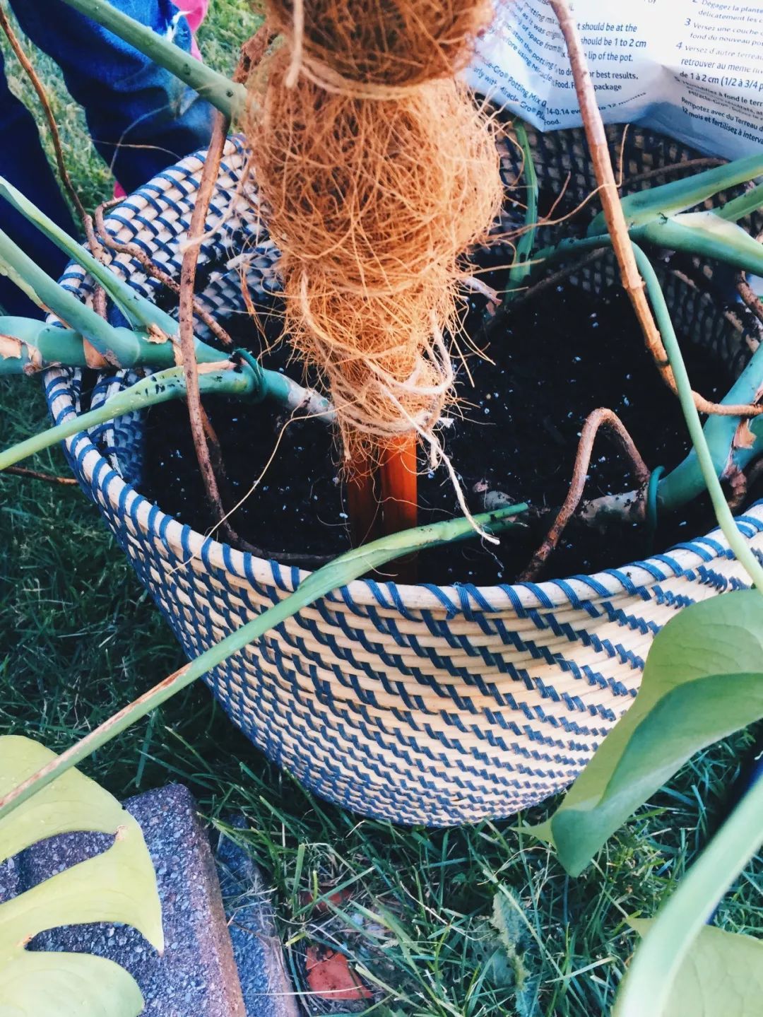 上面就是花友自制的椰棕皮竹子,不过还没完成,除了要在花盆里搭设好支柱,还要注意牵引植物的枝条,让它慢慢缠绕在柱子上,前期就用一些软绳,将植物的枝条稍微固定在柱子上即可。