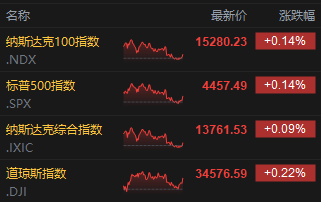 上周五,美股三大指数集体收涨。道指收涨75.86点,涨幅0.22%,报34576.59点;标普收涨0.14%,报4457.49点;纳指收涨0.09%,报13761.52点。