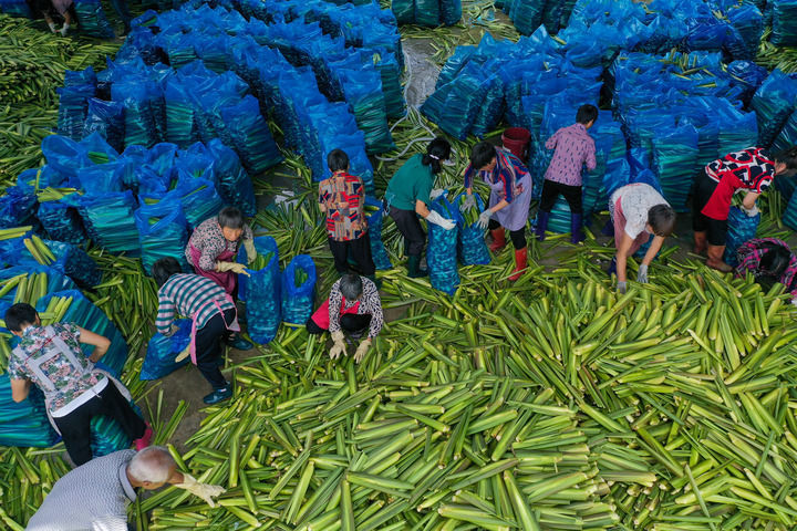 在浙江省丽水市景宁畲族自治县大漈乡大漈村茭白交易市场,村民将新收割的茭白打包冷藏(2021年8月25日摄,无人机照片)。