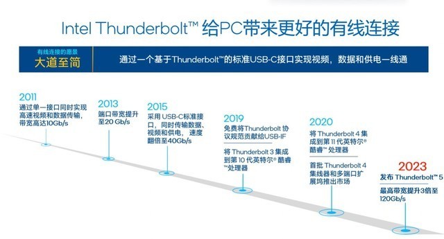 2023年9月12日晚9点,英特尔正式公布了全新的Thunderbolt 5,也就是雷电5接口,最高带宽达到120Gb/s!双向带宽达到80Gb/s,较雷电4接口提升3倍!强大的性能与丰富的功能,继续保持地表最强PC物理接口的纪录。